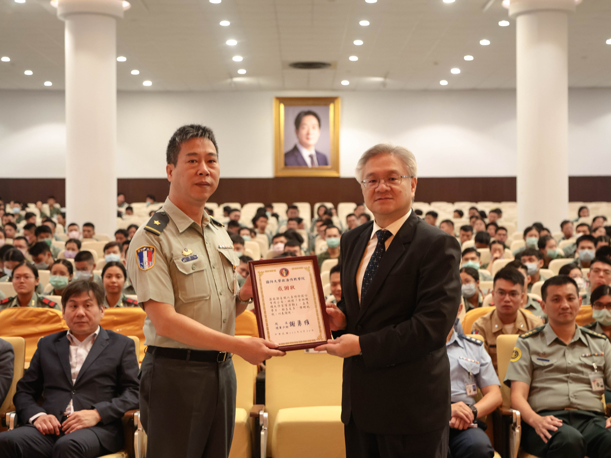 國防大學政治作戰學院院長謝勇維將軍(左)頒發感謝狀予臺銀人壽劉啟聖總經理(右)。