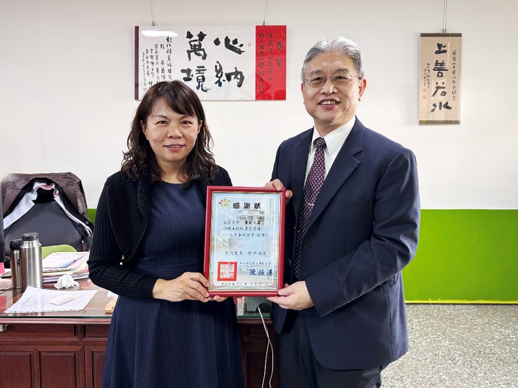 路上國小陳薇淳校長(圖左)致贈感謝狀,由臺銀人壽台中分公司李信益經理(圖右)代表受贈。