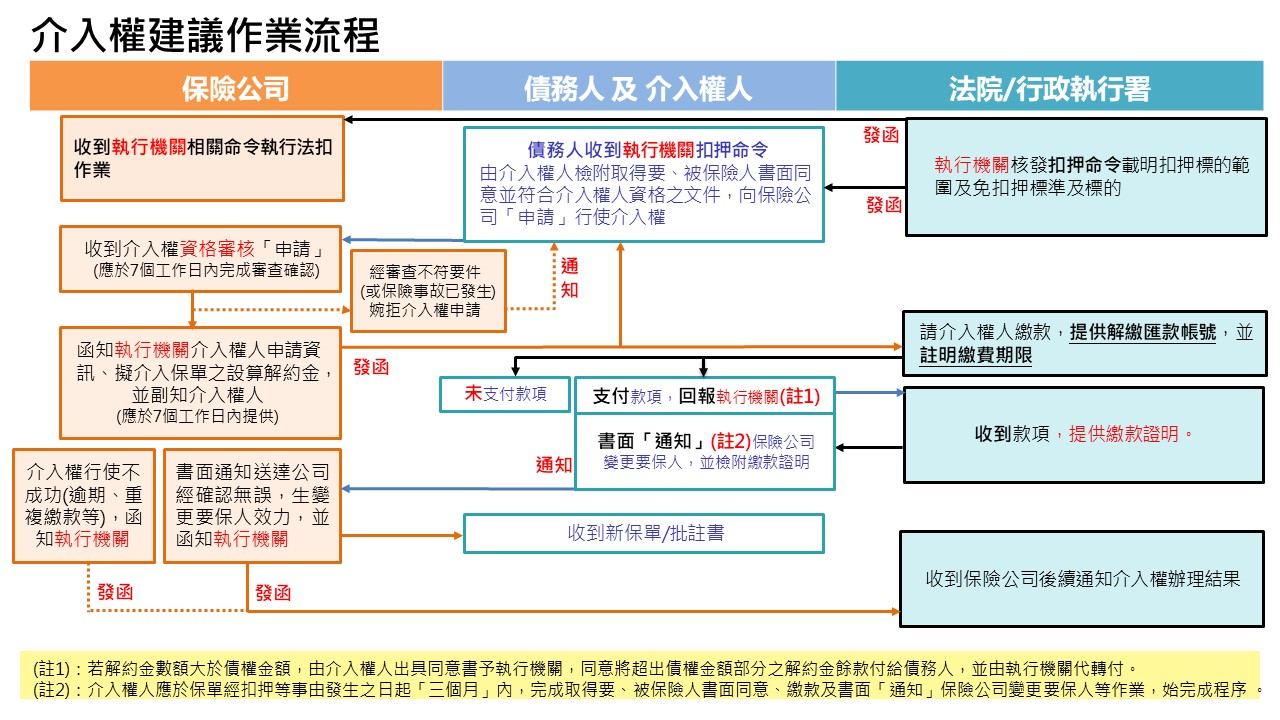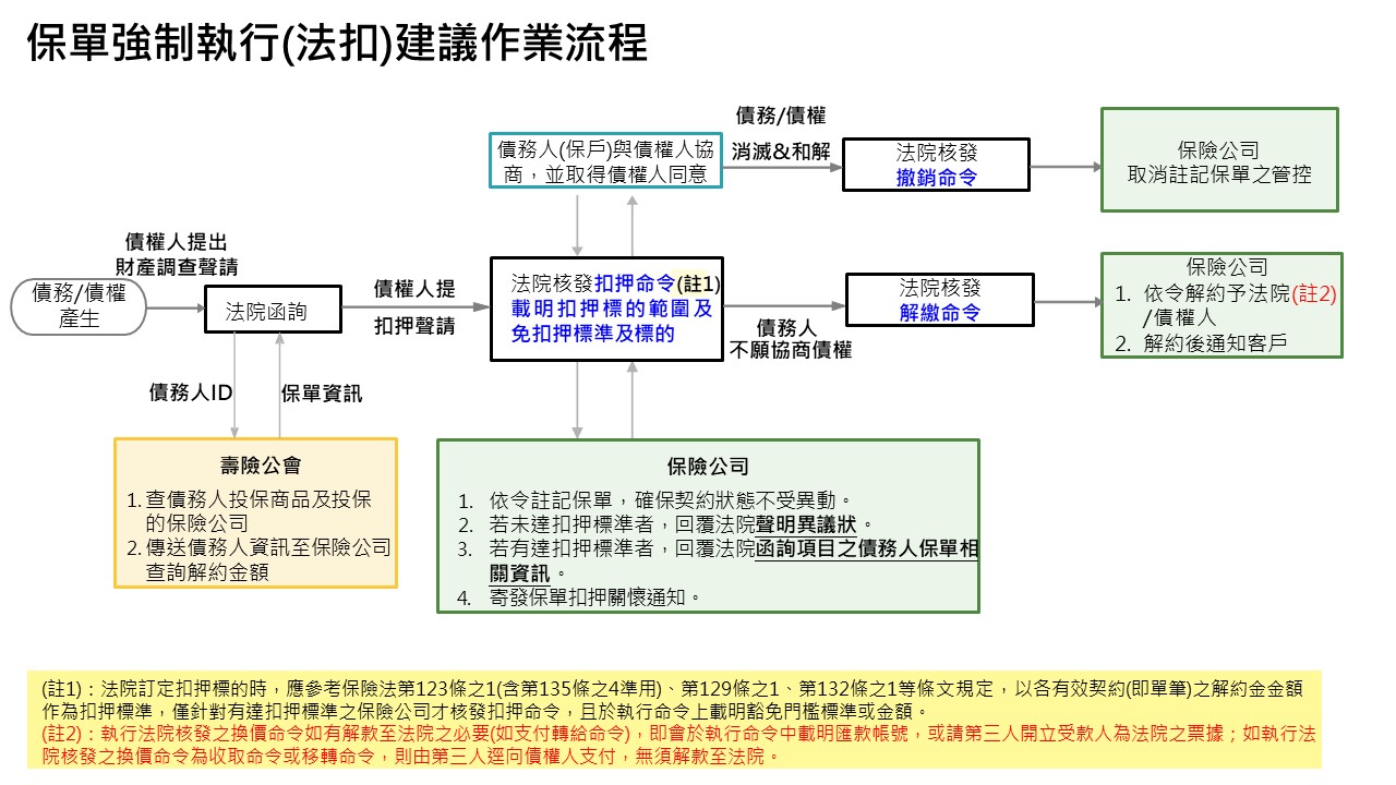 - 被扣押的保險契約(或保險給付)是維持債務人及其共同生活之親屬生活所必需者(如醫藥費等):債務人得依強制執行法之規定,向法院提出相關證明(如保險契約、繳交保費證明、診斷證明書、最近㇐年之財產所得清單等),證明難以維持生活,請求減少或免為執行。