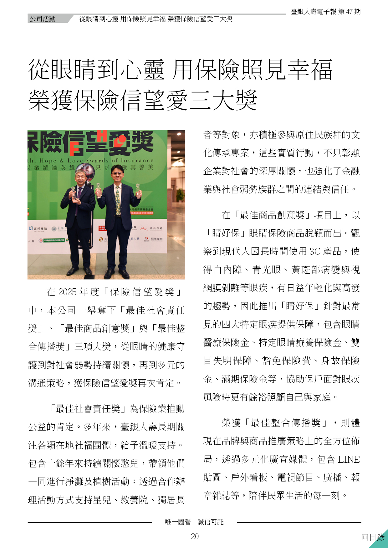 從眼睛到心靈 用保險照見幸福 榮獲保險信望愛三大獎 | 20 |