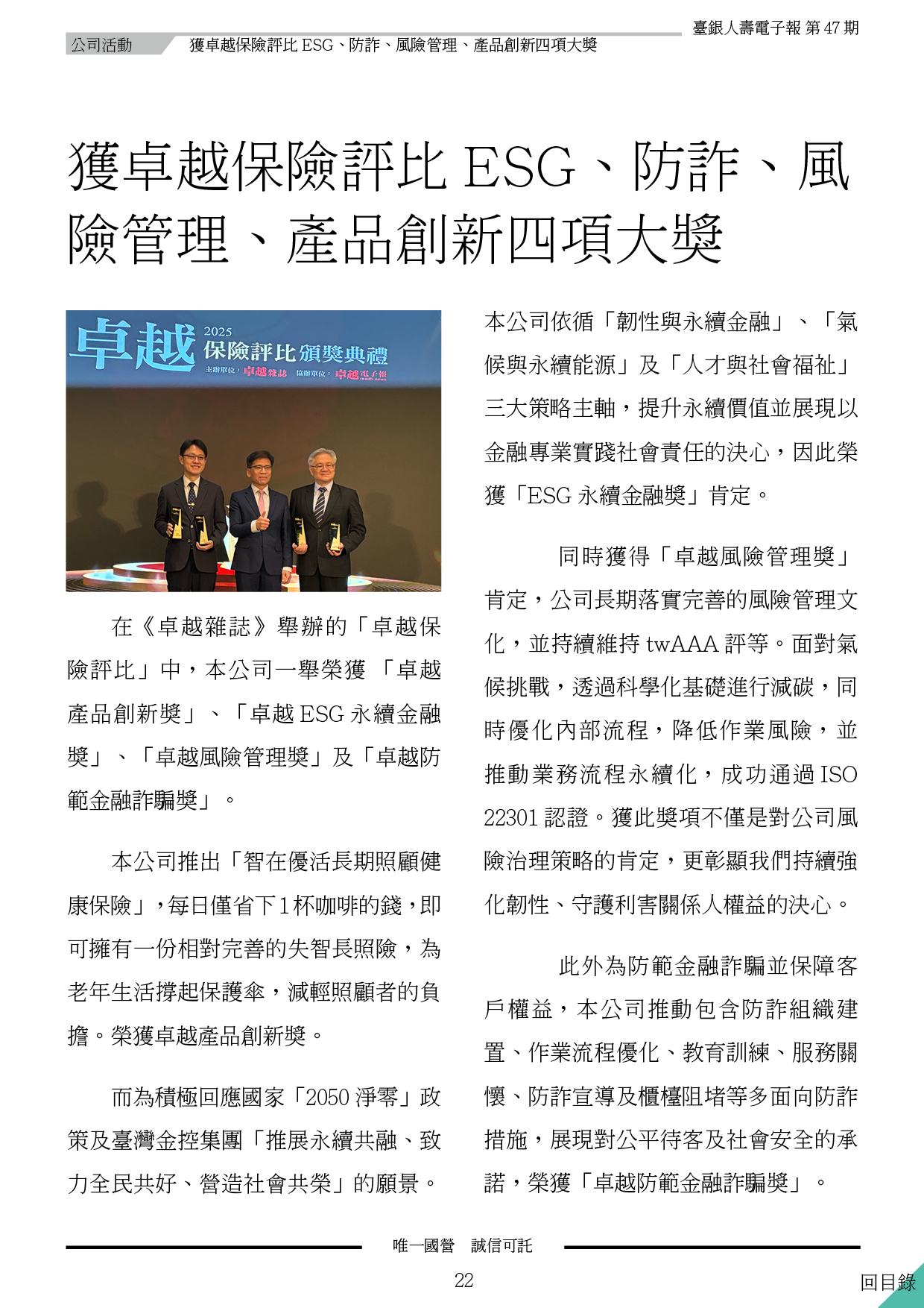 獲卓越保險評比ESG、防詐、風險管理、產品創新四項大獎 | 22 |